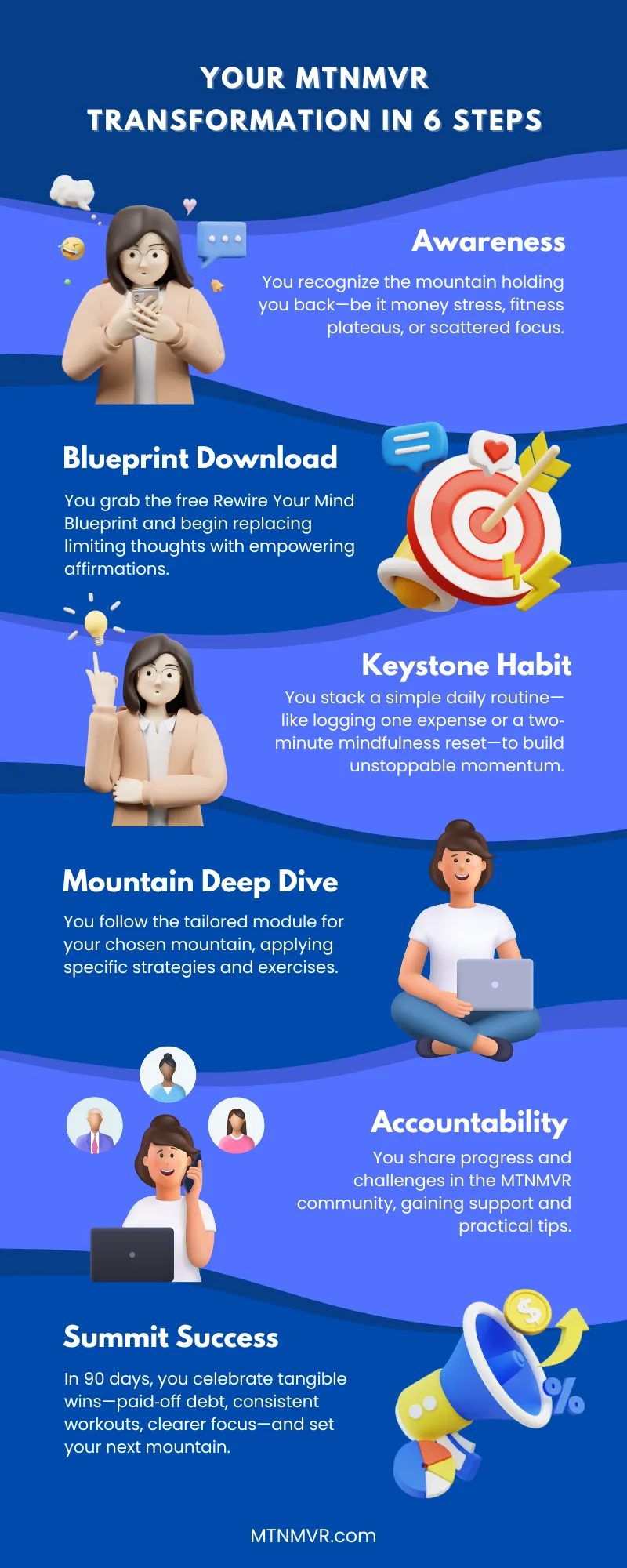 That’s the MTNMVR system: a personal clarity framework that helps you finally see what’s really been holding you back, and gives you the exact steps to start moving forward with confidence.