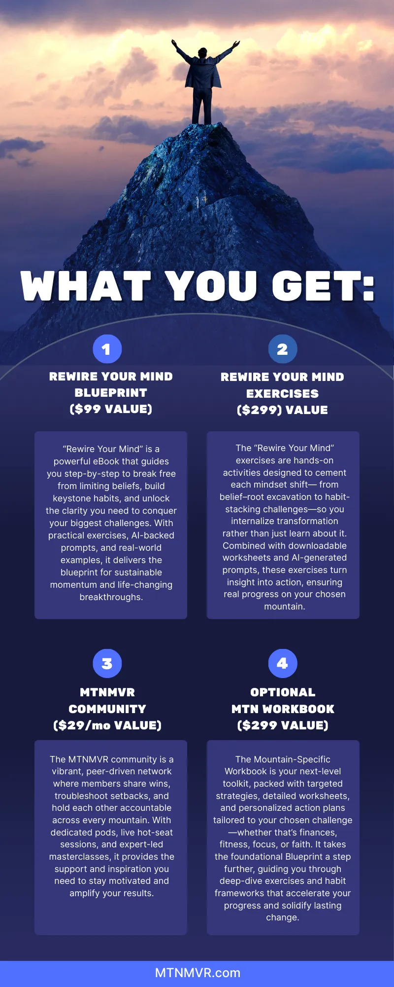 “After diving into MTNMVR’s Rewire Your Mind Blueprint, I’ve completely flipped my internal dialogue—from doubt to determination—and smashed goals I once thought out of reach. Now I wake up excited, tackle my to-do list with laser focus, and celebrate real momentum every single day.”